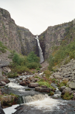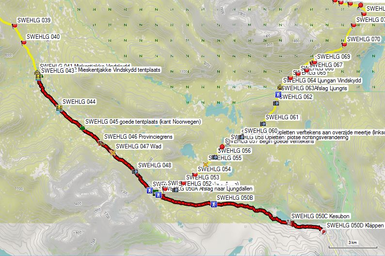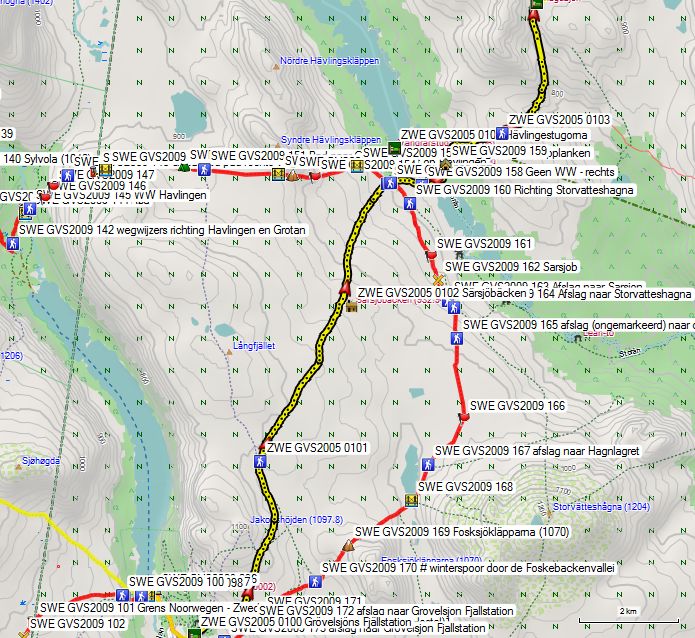De passage van de pas (GPS 503) is probleemloos. Aan de andere kant vind je het pad van Ryvang naar Grövelsjön en zie je voor het eerst weer mensen, die kiezen voor deze gemakkelijke toeristenwandeling en de heen- of terugreis per boot afleggen over het gelijknamige meer. De splitsing tussen de richting Valdalen en Grövelsjön (GPS 505) is niet zo goed aangeduid, maar het breedste pad is dat naar Grövelsjön. Het verschil in kwaliteit tussen het pad aan de Noorse en de Zweedse kant is hemelsbreed en het zegt veel over de verschillende visie tussen de twee landen, op paden en hoe die te onderhouden. De Noren hun benadering is: Het pad is wat het is en de toerist moet maar zijn plan trekken. De Zweedse benadering is: Hoe drukker het pad gebruikt wordt en hoe dichter bij de bewoonde wereld, hoe meer de natuur en de toerist een handje moeten geholpen worden. Aan de Noorse kant vind je dus een pad dat heel breed is en door het water uitgespoelde groeven vertoont. Aan de Zweedse kant is het pad geëgaliseerd met fijn gemalen grind en zijn er kleine en grote bruggen en bruggetjes aangelegd om het water toch via zijn natuurlijke weg te laten afvloeien. Het resultaat is dat je langs de Zweedse kant verschillende 70 en zelf 80 jarigen met behulp van stokken de klim ziet maken tot aan de grens. Je daalt langs dit luxepad af tot aan de hangbrug over de rivier en de daarachter gelegen parking (GPS 096). Hier vind je vuilnisbakken en een droogtoilet. Hier kan je kiezen tussen het kleine paadje aan de overzijde van de weg naar Grövelsjön Fjällstation of de weg volgen tot aan de T-splitsing en hier naar links gaan tot aan het Fjällstation (GPS 0100).