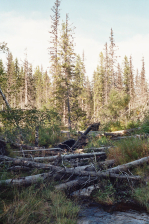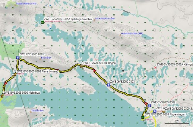 Vanaf de hut loop je langs het pad langs de telefoonleiding tot aan het kruispunt van paden in een klein bosje midden een moerassig gebied. Hier neem je de richting naar Skedbrostugan.Hier loop je over een rug tussen Rogen en een aaneenschakeling van grillige meren langs de andere kant. Soms is de rug hoog genoeg om droog te zijn. Dan groeien er bomen, maar daar waar de bomen ver uit elkaar staan is de bodem redelijk drassig. Er liggen naar Kungsleden-normen weinig planken en dus kan je je lederen schoenen met Gore-Tex voering best gebruiken. Het is hier bij momenten redelijk lastig lopen en dat zie je aan de tijd die ik nodig had om de toch niet zo lange tocht af te leggen. Op dit traject is er enkel drinkbaar water te vinden in het riviertje, ca 2km na de genoemde splitsing en nabij de hutten op de splitsing van het zomer- en winterpad in het uiterste punt van Rödviken.