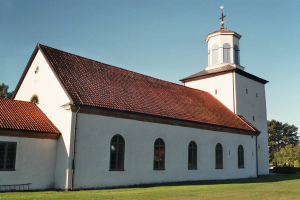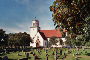Terug op de hoofdweg, rijd je naar links tot je terug op de weg 136 komt. Net voorbij het dorp Kalla, aan een soort garage, staat het bruine bord ‘Kalla g:a kyrka’ of ‘Oude kerk van Kalla’. Via een smal baantje kom je bij de kerk die ver buiten het dorp staat.