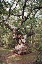 Terug op de hoofdweg kom je iets verder de aanduiding naar Trollskogen tegen. Ook hier vind je een ruime parking en geen aanduidingen die het parkeren voor kampeerwagens verbiedt. Het bos dankt zijn naam aan de grillige vorm die de bomen hier kregen onder invloed van de soms harde zeewind. Er zijn drie wandelingen van verschillende lengte en moeilijkheidsgraad. De rode is de langste en gaat tot het uiterste noorden van het schiereiland, met uitzicht op de vuurtoren aan de overzijde van de baai. Dit pad is niet geschikt voor kinderwagens. Het gele pad is wel geschikt voor terreinbuggies. Eventueel kan je hier ook het noordelijkste punt van het eiland bereiken via de centrale grindweg waar je op uitkomt te volgen in noordelijke richting. Je vind hier koeienvlaaien afkomstig van de langharige hooglandrunderen die hier door de bossen rondkuieren. Met hun horens zien ze er gevaarlijk uit, maar ze zijn het niet. Ik stond per ongeluk naast een kalf in de struiken en daar werd totaal niet op gereageerd. Wie het rode pad volgt komt ook nog langs het scheepswrak, de hoge eik en de duizendjarige eik. Een goede plaats voor een aangename wandeling.