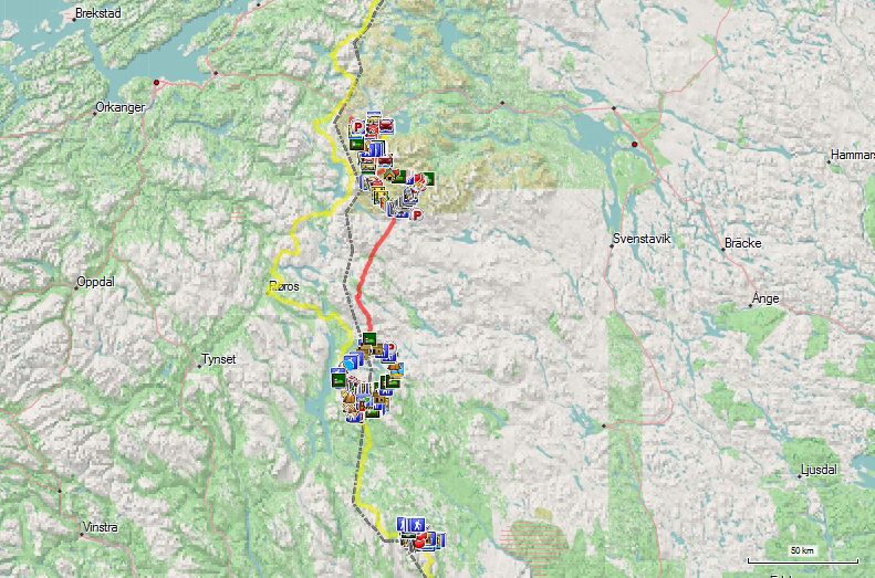 Wie tijd over heeft en nog nooit in Röros geweest is, moet van de gelegenheid gebruik maken om het te bezoeken. Het stadje is geklasseerd als Unesco werelderfgoed. Het is een oud mijnwerkersstadje, waarvan de historische kern, letterlijk gebouwd op de berg ijzerertsafval, wonderbaarlijk goed bewaard is.De weg van Funäsdalen naar Ljungdalen is met een hoogste punt van 975m, de hoogste publieke weg van Zweden. Je rijdt er over Flatruet en het is inderdaad een vrij vlakke hoogvlakte. Er staan borden die het wildcrossen met terreinwagens verbiedt. Dit is nog altijd een grindweg en als je hier over rijdt terwijl het regent of als de weg nog niet helemaal is opgedroogd, zal je auto niet om aan te zien zijn van het stof dat aan de flanken en wielen kleeft.