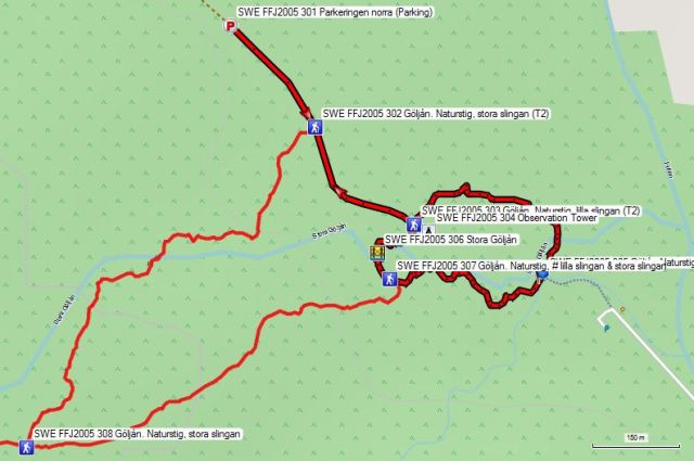 In de loop van 30 augustus 1997, toen deze feiten zich voordeden, werd ook de benedenloop van de rivier verlegd naar een nieuwe bedding door de enorme kracht van het water. In het bezoekerscentrum van het park vind je een ééntalig Zweedse folder over het gebeuren. De folder is wel interessant voor de kaartjes, die je kunnen helpen bij de oriëntatie. Er zijn twee wandellussen: een grote van 4km en een kleine van 1km. De kleine lus is een grotendeels gestabiliseerd pad met aangevoerd grind of loopplanken, de grote lus, betreft een meer natuurlijke pad. In de rivierbeddingen zelf, moet je opletten voor de oriëntatie, gezien er weinig steunpunten in de vorm van bomen zijn, heeft men de merktekens moeten aanbrengen op stenen. Er wordt ook gebruik gemaakt van gekleurde metalen plaatjes en houten pijlen met de aanduiding Stora Slingan (Grote Lus) en Lilla Slingan (Kleine Lus).