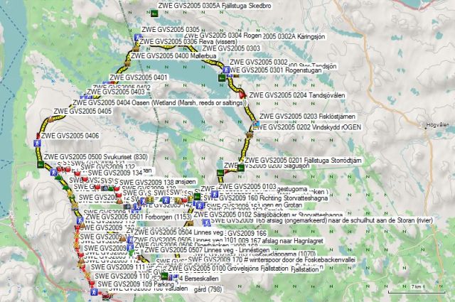 Tegenover de ingang van het Fjällstation vind je bordjes met de verschillende wandel en langlauf bestemmingen. Wie niet vertrouwd is met wandelen in Zweden, moet weten dat er een duidelijk onderscheid is tussen zomer en winterpaden. Ze worden verschillend aangeduid op de stafkaarten en hebben soms ook een specifieke traject keuze. Een winterpad zal steeds kiezen voor de meest geleidelijke klim en hoeft geen rekening te houden met drassige stukken of zelfs niet te grote meren. De term ‘Ruskmarkering’ wijst op het feit dat men het traject over het meer zal uitzetten van zodra het voldoende stevig bevroren is. Op het traject tussen Rogen en Skedbro zal je op meerdere plaatsen langs het pad de palen met Andreas-kruisen in de bomen zien hangen, te wachten op de volgend winter. Een zomerpad dient wel rekening te houden met de drassige stukken en meren, maar mag iets steiler klimmen. Zomerpaden worden aangeduid met oranje of soms rode verf. Winterpaden worden op het terrein aangeduid met de reeds vermelde Andreas-kruisen. Omwille van de verschillende trajectkeuzes kan een winterpad zowel langer als korter zijn dan een zomerpad, afhankelijk van de plaatsgesteldheid. In Grövelsjön zijn de winterpaden meestal korter, gezien ze over de meren gaan in plaats van er rond zoals de zomerpaden.