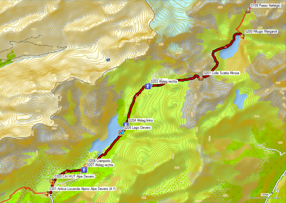 Eerst klimt het pad bijna evenwijdig aan de grindweg richting Rifugio Riposa (GPS2614BB). Dan gaat het recht omhoog, en vervolgens in een paar zigzaggen omhoog. Men probeert je zo veel mogelijk langs et officiële pad te leiden, maar een Italiaan die een direttissimo ziet…
