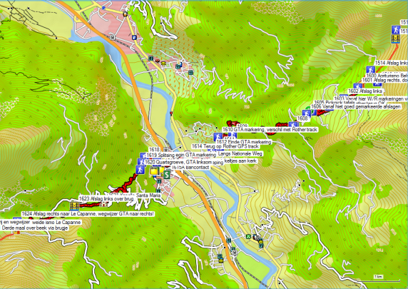 De enige goede markeringen die je vindt zijn die van de GTA en dus volg je die, en daal je probleemloos af richting dal. Ook hier moet hier opletten voor kleine denappels op het pad, die als kogellagers of Rolling Stones werken onder de zolen van je schoenen. Hoe dieper je daalt, doe meer je geconfronteerd wordt met het geluid van de autosnelweg in het dal. Ook de sokkels van elektriciteitspylonen wijzen je op de kenmerken van onze moderne maatschappij, die in een berglandschap nog eens samengedrukt en daardoor versterkt worden in de dalen. Aan het kerkje van het gehucht Marzano (GPS2702) eindigt de GTA markering. Je daalt af via het asfalt richting San Giuseppe (GPS2703), alwaar je uitkomt op de iets bredere SP209.