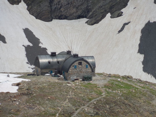 You need to take a deep breath, after looking down from the pass into the valley. What seems on the OSM map neatly drawn zigzag path, is in reality in early summer buried below a thick and above all steep snowfield. Those with a little bit of common sense, know that it’s not advisable to descend this snow field. So you’d better start looking for an alternative route.