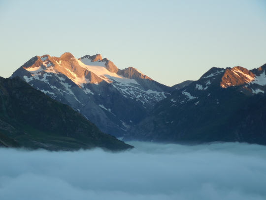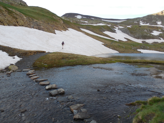 Personally, I would not make such an early start anymore for journeys over 2300m in the Pyrenees. This primarily has to do partly with the poor state of the way marks on the ground and secondly, the infrequent use of the HRP, causing the snow field to be quite often without a clearly visible and useful spur in the snow. For that reason it is essential to carry and know how to handle an ice axe and crampons in early summer, more so than on comparable routes in the Alps.