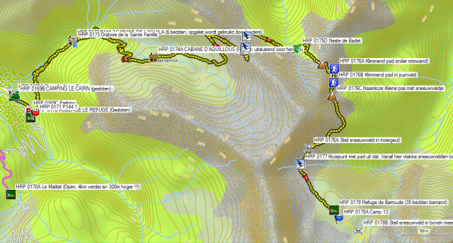 HRP follows the trajectory: REF SOULA – REF PORTILLON (9,3km + 1365m -448m). This stage is evaluated by Ton Joosten as a level E stage (Exceptionally difficult). Considering the fact that I observed that during the descent of the PORT D’AYGUES TORTES (level 1 = very difficult) a traveling companion had trouble descending in steep snowfields, I found it irresponsible to drive up the level of difficulty and I made the decision to continue to Bagnères-de-Luchon along the GR10, despite the fact that the weather conditions were good.