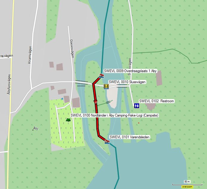 Bij de Ålhusdam (18) moet je je boot een 30-tal meter overdragen. Er is een soort kanoglijbaan en drijvend ponton die dit werkje iets minder zwaar maken.