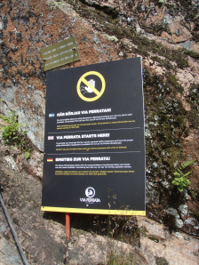 Daar vind je ook het bord dat je in het Zweeds, Duits en Engels meedeelt dat je eerst dat je eerst een bedrag dient te betalen en tevens in het bezit moet zijn van een Via Ferrataset en moet weten hoe die te gebruiken. Zoniet kan je beboet worden met een boete van 1000 SEK (110€). Wie bevoegd is om die boete te innen staat er niet bij :-(.