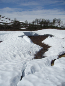 Hogerop vind je nog een splitsing (GPS 105), namelijk die tussen een winterpad (dat niet op de kaart voorkomt, maar aangeduid is met rood Andreaskruis) en een zomerpad en nog een afslag naar de Aigertstuga, die niet op de kaart voortkomt. Vanaf deze splitsing is het zomerpad naar Aivak aangeduid met de houten ongeverfde Andreaskruisen. Bij GPS 106 passeer je een brug, en bij GPS 107 vind je de splitsing die wel op de kaart zichtbar is tussen een winterpad met ongeverfde houten kruisen en een zomerpad met cairnes in de vorm van opstaande vlakke stenen. Dat is nodig, want met de vele sneeuw, dienen ze ook dan zichtbaar te zijn. Dit pad is weinig belopen. Je moet dus constant de sneeuw uit proberen, en hopen dat die het houdt.