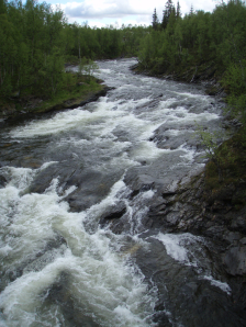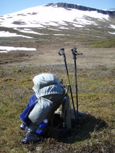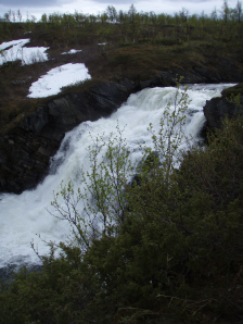 De rivier die je hier moet dwarsen (GPS 110) heeft hier en daar nog oevers van sneeuw. De stroming is te sterk en het waterpeil net te hoog voor mijn combatshoes. En dus wordt het waden. Mogelijks is dit in normale omstandigheden geen probleem, maar een brug is waarschijnlijk wat te veel gevraagd voor een weinig belopen pad. Op de Kungsleden zou die er zeker liggen, zelfs voor minder 😦 .