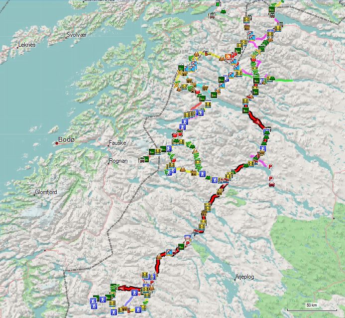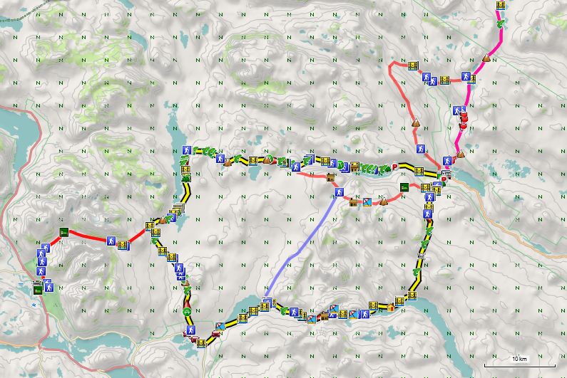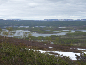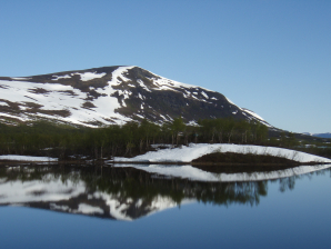 Maar aangezien ik niet meer per openbaar vervoer reis, ben ik dus gebonden aan tochten in lusvorm. Toen ik de grote hoeveelheid sneeuw in de bergen opmerkte bij aankomst in Ammarnas, heb ik al meteen mijn grootse plannen opgeborgen en ingeruild voor een korter en realistischer project, namelijk de hieronder beschreven lus. Oorspronkelijk voorzien voor 6 dagen heb ik ze uiteindelijk uitgevoerd in 5. Vier dagen schitterend weer gevolg door een nacht met regen en een vijfde droge dag. Maar zoals gezegd begonnen de ingewanden ernstig op te spelen, waardoor ik blij was dat er geen zesde dag maar bij hoefde.