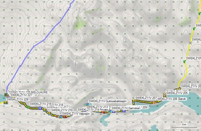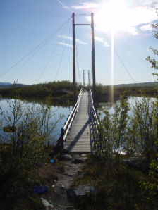 Vanaf de wegwijzer loop je richting meer, en vervolgens ga je evenwijdig met de oever in wijzerzin. Wanneer je voor je elektriciteitspalen ziet, ga je links door een poort van het type dat je reeds kent en vervolgens neem je een pad naar rechts aangeduid door palen met Andreaskruisen. Alzo loop je richting de bruggen bij GPS 228 & 229. Over de bruggen, volg je vrij probleemloos het pad, eerst vlak bij de oever, vervolgens verder af. Het stuk is wat saai. Na 2,5u en drie bruggen bereik je het begin van de weg aan Biellojaure. Hier vond ik een geschikt plekje om te kamperen net boven de weg (GPS 301).