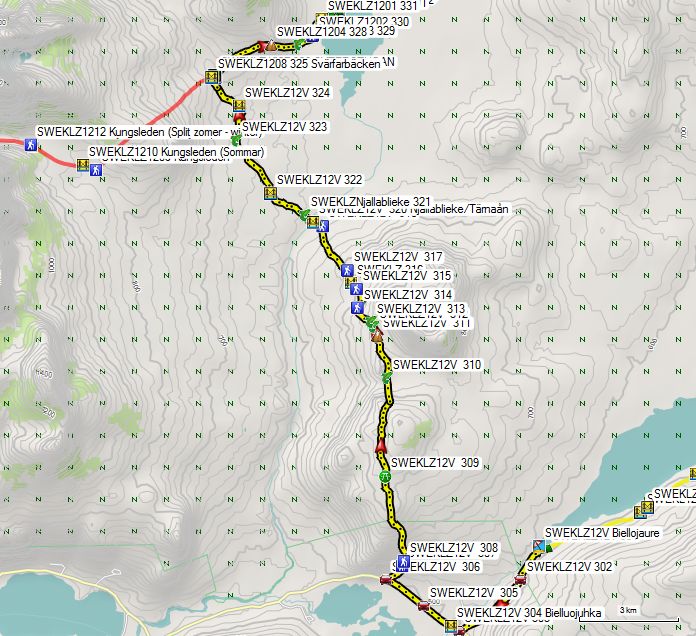 Wie digitaal werkt, vindt het traject van de Kungsleden en andere belangrijke paden terug op de digitale kaarten van freizeitkarte-osm.de