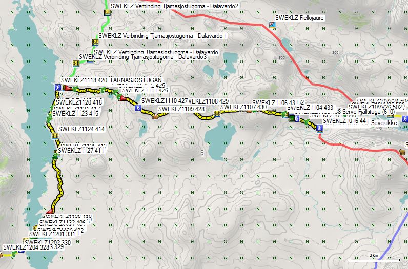 Bij GPS 427 dwarst het winterpad het zomerpad. Bij GPS 428 bereik je een eerste hoogste punt. Vervolgens daal je af richting brug (GPS 430). En vervolgens gaat het terug omhoog richting zadel (GPS 431) naast de Servetjakke. Bij GPS 432 vind je een grote rotsblok waar je wat kan schuilen voor de wind. Vanaf hier vat je de definitieve afdaling af richting Servestugan. Na de brug (GPS 434) vind je twee kampeerplaatsen (GPS 435 & 436) langs een riviertje. Bij GPS 437 vind je een wegwijzer. Rechts over het brugje vind je de Servestugan.