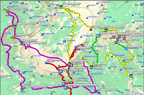 Dag 3 Preiner Gscheid – Karl-Kantner-Steig – Karl Ludwig Hutte – Gamsecksteig – Nasskamm – GH Moassa – Preiner Gscheid (geel)