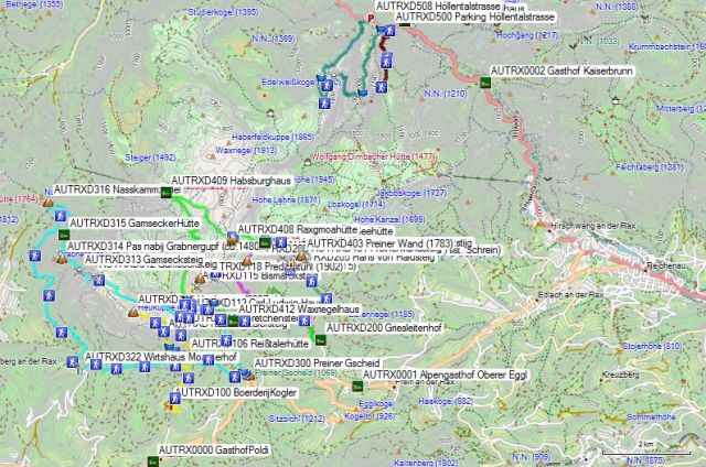 Voorbij de eerste veerooster vind je rechts wit-groen-wit tekens. Volg deze. Je dwarst een aantal malen een jeepweg. Op een bepaald ogenblik moet je deze een beetje naar links volgen tot je deze weer verlaat via het pad. Je klimt weer verder omhoog tot je in aan een kruispunt van paden komt gelegen in een nogal drassig stuk met veel planten die er uitzien als kleine rabarber (AUTRXD103) (sorry, ik ben geen botanicus). De juiste richting staat hier niet aangeduid. Ga naar links richting GH Moassa (op de stafkaart F&B aangeduid als Wh Moasserhof 1160m) en een 50 tal meter verder vind je een pijl schuin rechts richting Rax en Reisstalerhutte. Op een jeepweg ga je naar links (AUTRXD104) en volg je de wit-geel-wit markering tot je aan een nieuw kruispunt (AUTRXD105) komt en een beetje verder de Reisstalerhutte (AUTRXD106) zelf ziet.