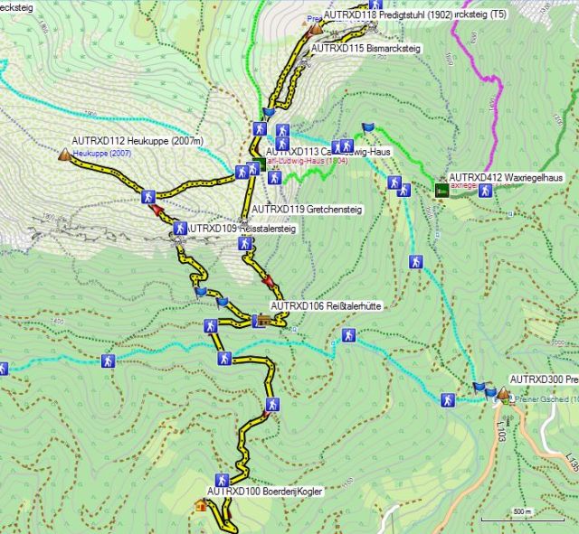 Voorbij de eerste haarspeldbocht vind je reeds wit-geel-wit tekens, die je een steil pad opsturen. Het is echter beter langs de jeepweg te blijven lopen, die ook wit-geel-wit gemarkeerd is. De jeepweg maakt niet te veel omweg en stijgt nog ruim voldoende om aangenaam te zijn. Nadat je 200 hoogtemeters gewonnen hebt (AUTRXD201), vind je naar rechts een wit-groen-wit gemarkeerd pad met aanduidingen: Preiner Wand en Bachinger Bründl. Rechtdoor gaat de Göbl-Kühn Steig naar de Waxriegel Hutte en de Seehutte.