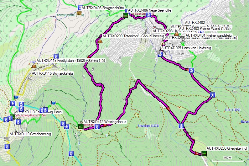 Dan klim je via de reddingshut met noodtelefoon, H. Nemecek Hutte of Raxgmoa Hutte (1858m) (GPS-punt 26). Je klimt verder over het Trinksteinsattel tot 1880m in de richting van de Habsburg Hutte (1785m) (GPS-punt 27). Je loopt terug in de richting van het Karl Ludwig Hutte (1804m). Op het zadel onder de hut neem je het normale pad naar beneden. Aan een bordje naar het Waxriegel Hutte neem je dit kleine paadje tot aan de hut. Je loopt over het terras van de hut en vindt aldaar de wit-geel-wit markeringen van de Göbl-Kühn Steig die je naar beneden volgt tot Griesleiten (GPS-punt 12).