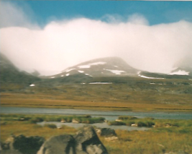 Ondertussen begint het uit te klaren en worden de gletsjers zichtbaar in al hun glorie. Dit is de reden waarom ik deze route gekozen heb. Van hieraf heb je zicht op de meest spectaculaire kant van de Sarek-groep. Ondanks dat de meeste mensen door de Ruotesvagge lopen, is het zicht langs deze kant echter mooier. Maar ja, in de Ruotesvagge is er een spoor (vaag pad) en is de oriëntatie minder moeilijk.