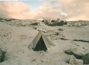 De volgende morgen wordt ik wakker. Gedurende de nacht heb ik neerslag gehoord op het tentzeil. Ik stel vast dat de buitenzijde van mij synthetische slaapzak klam is. Ik heb dit nog maar één keer eerder meegemaakt. Ik open mijn binnentent en zie een wit schijnsel van onder de buitentent komen. Mijn bange voorgevoelens worden bevestigd. Ik ben ingesneeuwd.