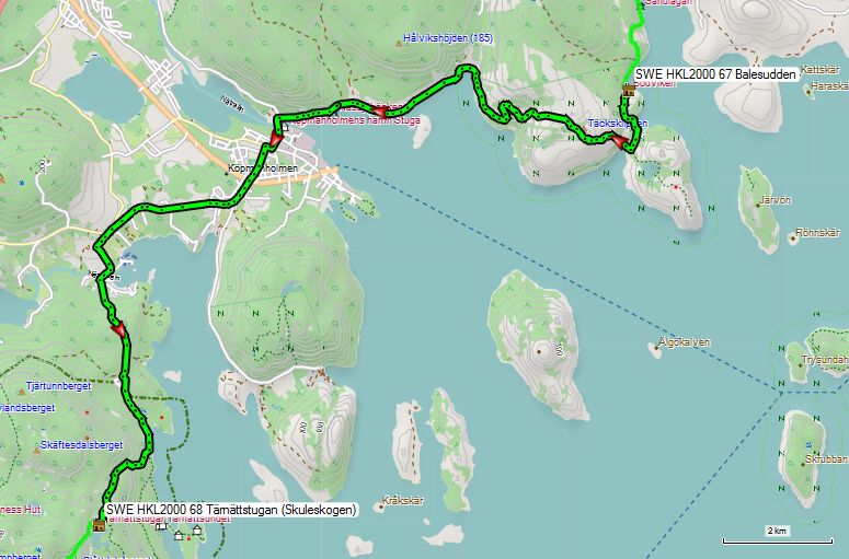 De volledige lengte van deze route is ca 130km. Ze situeert zich tussen de Hoge Kustbrug en Ornskoldsvik (uitgesproken als “Ornscholdsvik”) en ze kan in 6 dagen afgestapt worden. Het aangename van deze route is, dat je er gratis kan overnachten in beschikbare gesloten huisjes en de mooie uitzichten op het water, de eilanden en schiereilanden. Voornaamste nadeel van de route vind ik persoonlijk het feit dat de route over ruim de helft van de afstand over verharde wegen leidt. Met verharde wegen bedoel ik zowel asfalt als steenslagpistes. Het gebied is verhoudingsgewijs druk bewoond omwille van de nabijheid van de kustweg E4.