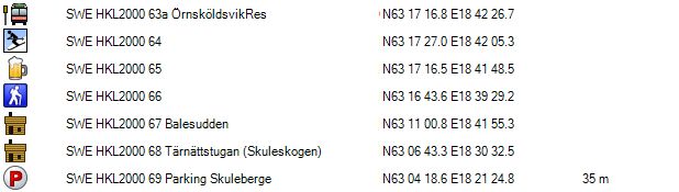 De expressbus stopt in elk geval aan het busstation van Ornskoldsvik. Vanaf het busstation loop je in de richting van de springschans. Ga onder de spoorwegbrug door, en ga vervolgens onder een buisleiding door over de rijbaan. Een beetje verder tref je de bordjes van de Hoge Kustleden. Eerst ga je naar de voet van de springschans (punt 64). Daarna gaat het pad verder omhoog, diagonaal de helling op, waarbij een jeepweg een aantal keer gedwarst wordt. Op een steenachtig gedeelte is het een beetje onduidelijk en moet je in dezelfde richting verder lopen tot aan de basis van een reeks houten trappen. De laatste is adembenemend lang, maar men is zo vriendelijk geweest om op een paar plaatsen rustbankjes te plaatsen ;-). Aan het einde van de langste trap is het opnieuw wat vaag. Je loopt in de richting van de vlaggenmast en vervolgens in de richting van het café‚ (punt 65). Vanaf dit punt is de markering veel beter. Je daalt af via een paar trappen, vervolgens door een boszone, langs een parking aan een meertje. verder bergaf tot je terug in de bewoonde wereld komt. Je gaat over een buisleiding en vervolgens over een sluis en door het ‘centrum’ van Svedjeholmen. Punt 66 is de grote weg door het dorp.