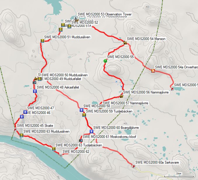 De weg langs Moskoskorsu is namelijk vrij lastig. Eerst passeer je een brug (punt 59) en vervolgens bereik je een wegwijzer( punt 60) met de richtingen, Muddusfallet en Sarkavare. Er is echter een derde pad, en dat is de weg naar Moskoskorsu.