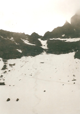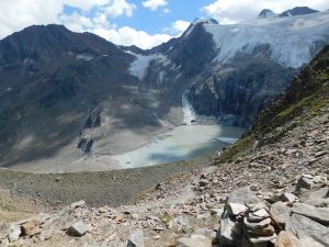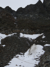 Hogerop eindig je in een steenwoestijn. Aan de bovenzijde van de kom vond je in 2010 een sneeuwvlek, die je langs de bovenzijde passeert. Voor 7 jaar liep deze sneeuwvlek nog door tot de onderkant van de kloof. Nu blijft er nog een dun laagje ijs over. In 2022 was deze vlek volledig verdwenen. Dat spaart alweer een heikel punt, vooral als je uit de richting van de Bremer Hütte komt. De opwarming van de aarde heeft ook soms voordelen…