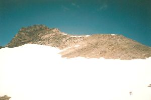 Eenmaal over de gletsjer met je nog langs de met stenen bezaaide graad omhoog tot aan het kruis. Let op voor valpartijen aan de achterzijde van de top.