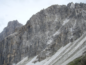Ook eventuele technische moeilijkheden zijn nu verdwenen. Je klimt vervolgens tegen de rechte flank op. Hier vind je veel schuine rotsplaten. Sommige stukken zijn kabelgezekerd. Elders moet je je een weg banen in de breuklijn tussen de platen, waar je wat steun vind voor je voeten.
