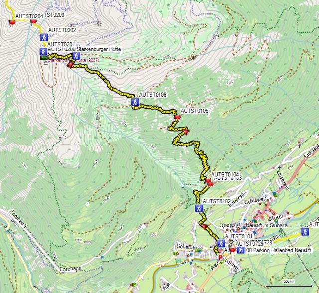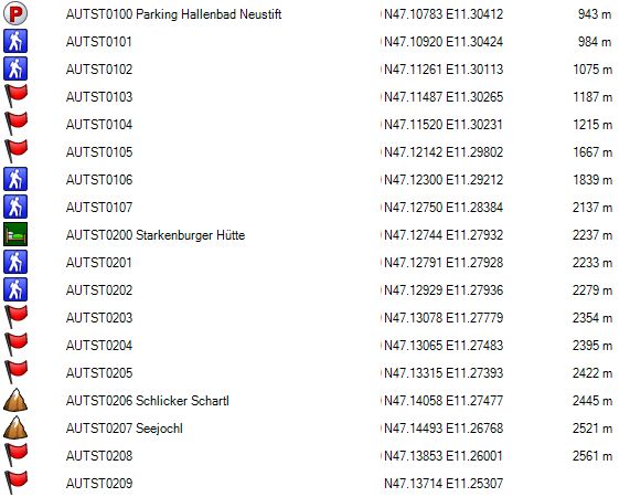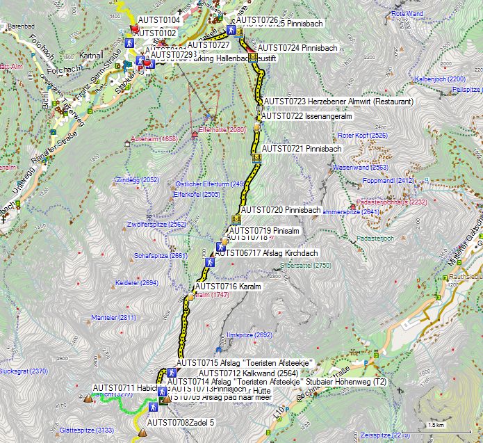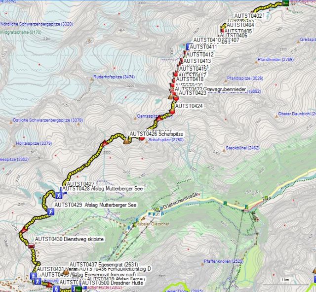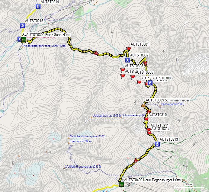 Zadel 4 (AUTST0707) bereik je na 1u15’, Zadel 5 (AUTST0708) na nog eens 20’ en de Innsbrucker Hütte (AUTST0710) na nog eens 40’.