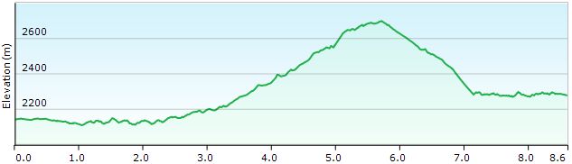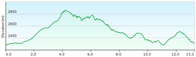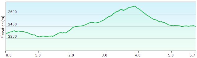 Vervolgens gaat het weer naar beneden en rond je een tweede kom (1u30’). Het zadel onder de Pramanspitze bereik je na nog eens 45’. In dit gedeelte is de bodembedekking hoofdzakelijk gras. Vooral bij regenweer is dit geen voordeel.