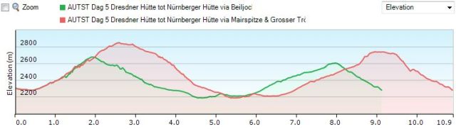 Tot aan de Innsbrucker Hütte is dit reeds een lastige dag. Je met vijf keer naar beneden en terug naar omhoog, samen goed voor 1250m stijgen en 1300m dalen in ca. 6u.