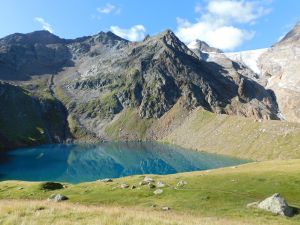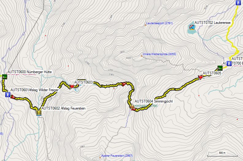 De afdaling is vrij alpien, met grote rotsblokken, waartussen je je een weg zoekt. Je moet goed opletten op de tekens, want het pad springt niet echt in het oog. Bij GPS AUTST0518 komen beide varianten terug samen. Wat dieper ligt de Nürnberger Hütte (AUTST0600) (2u30’ ipv 3u (solo)).
