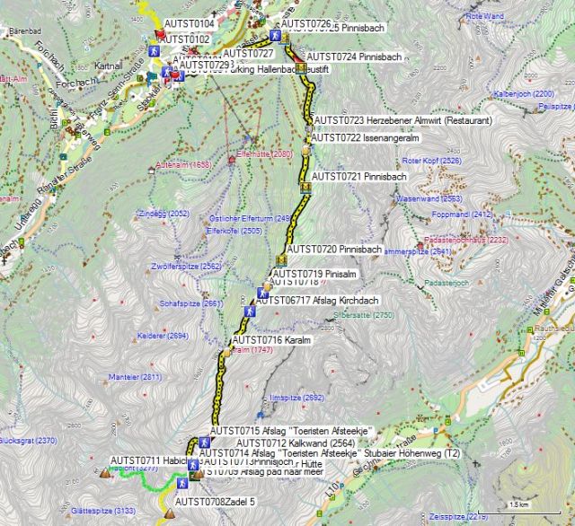 Onderaan de ketel is er een pad meer en soms een “directissimo” langs de weideomheining. Eenmaal aan de Karalm (AUTST0715) bereik je de jeepweg. Vanaf hier kom je ook mountainbikers tegen. Karalm is een eerste van 4 drankgelegenheden voor je Nieder (AUTST0726) bereikt. De weg is voor het overige redelijk saai.
