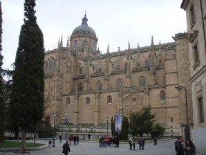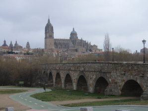 Achter de kathedraal loopt een straat (Avenida de la Constitution), waarin tramrails liggen. Je vindt hier halfweg een dwarsstraat, zijnde de Calle Federico Sánchez Bedoya. 30m de straat in vind je schuin rechts de Calle Cristóbal de Castillejo en vervolgens de Calle Jimios. Hier vind je de eerste gele pijlen, die je probleemloos de stad uitleiden. Na een opeenvolging van smallere straatjes, kom je in de bredere Calle Reyes Católicos, alwaar je naar links gaat richting de brug over het Canal de Alfonso XIII.