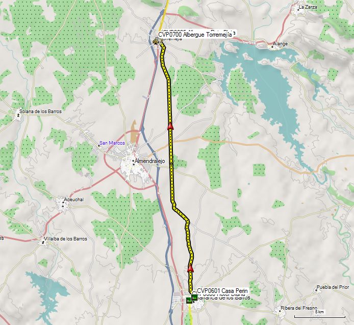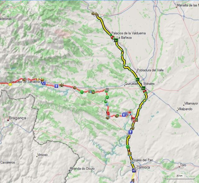 Rechtdoor tot aan een hoogspanningslijntje. Daar ga je naar rechts over een smal pad, met ondertussen vervaagde pijlen aangeduid pad tot aan de N630. Steek deze over en vervolg langs een hoogspanningslijntje tot aan het bord Benavente 42. Hier kan je ofwel de GP volgen, ofwel de N630 blijven volgen tot aan de brug. De “omweg” is wel kleiner dan je zou vermoeden op basis van de GPS tracklog. Net voorbij een huis gaat de GP naar rechts en klimt naast de omheining omhoog, daar waar de tracklog verder blijft afdalen tot aan de oever van het meer en zo de oever volgt om dan vervolgens terug te keren onderaan de brug. Opletten voor honden langsheen de Camino.