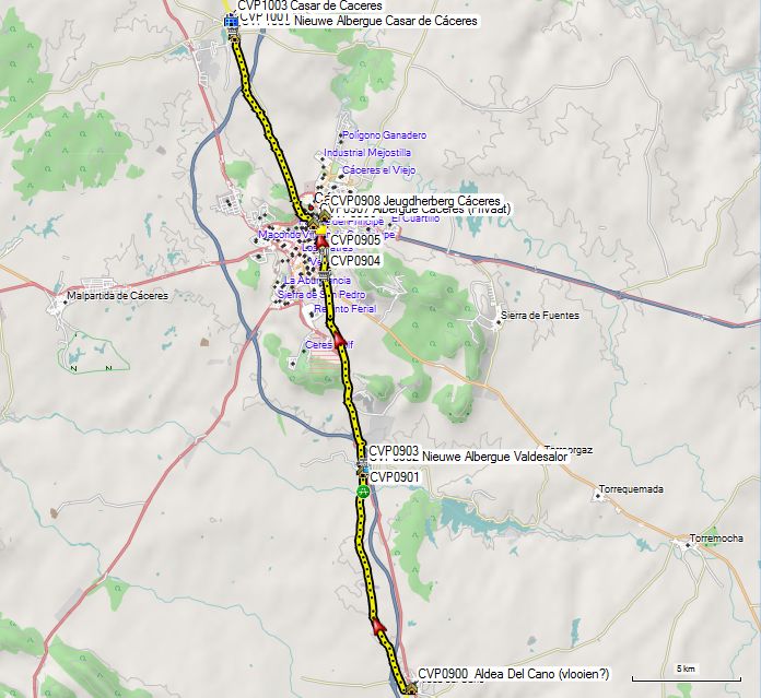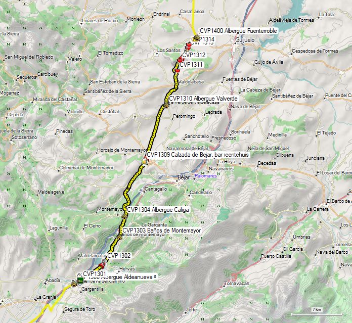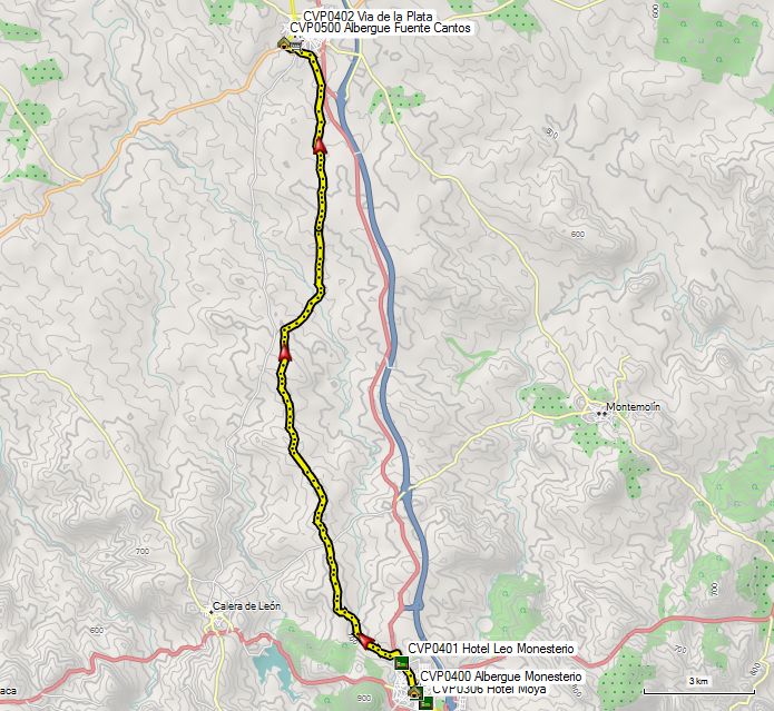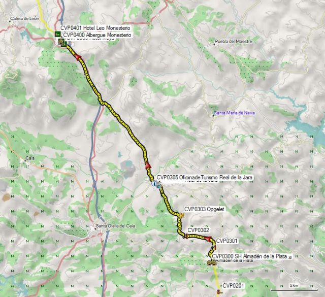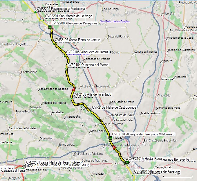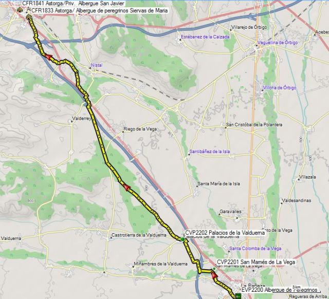 Vanaf La Nora is het parcour van de Via de la Plata volledig gewijzigd. Het loopt nu niet meer langs de in de Nederlandse gids beschreven weg, maar langs de normale asfaltweg naar La Baneza. Er zijn maar een paar korte stukjes waar je van het asfalt afkan, en deze zijn dan nog niet goed aangeduid. Wat de reden is van het verleggen van het parcour, heb ik niet kunnen achterhalen.