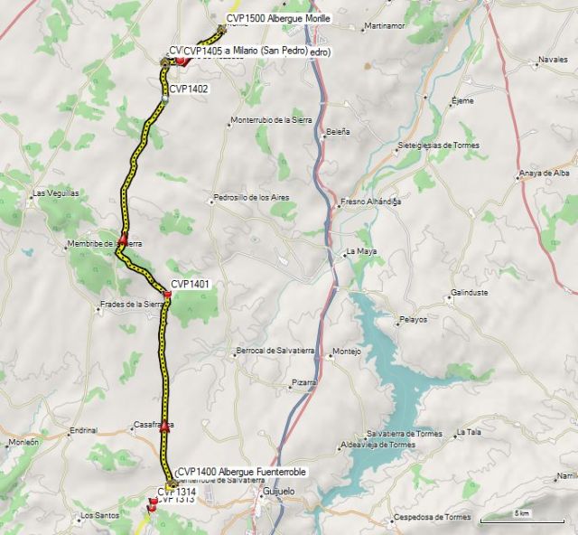 Op het kerkplein ga je rechtdoor. Je komt aan een splitsing. Afhankelijk van de waterstand kies je voor de variante links, door een kom en over de rivier via een betonbrugje of bij een hoge waterstand kies je voor de N630. Bij goede weersomstandigheden ga je dus door de kom en passeer je onderlangs de Ermita. Je klimt weer omhoog, alwaar je op een weg komt. Je volgt de GP naar links en komt niet op de N-630 zelf, maar gaat naar links via de steenslagpiste. Je gaat niet langs de meest steile route die aan de kerk uitkomt, maar via de iets minder steile, langs het gemeentelijk magazijn.
