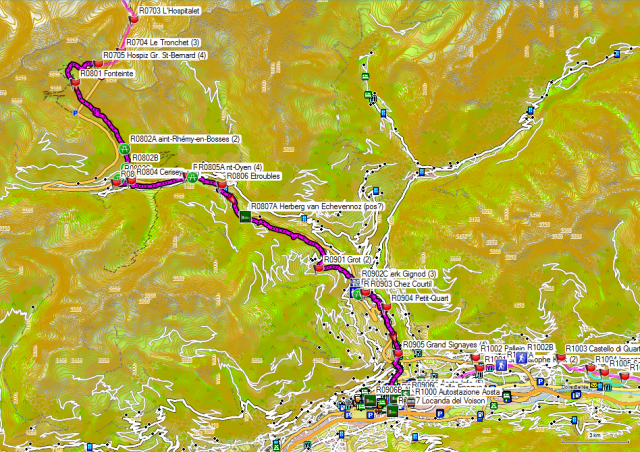 - Tot Martigny: verhard tot halfverhard en deels onverhard, maar wel steeds een goede routekeuze gezien de omgeving (smal dal met autostrade, weg, spoor en Via Francigena).