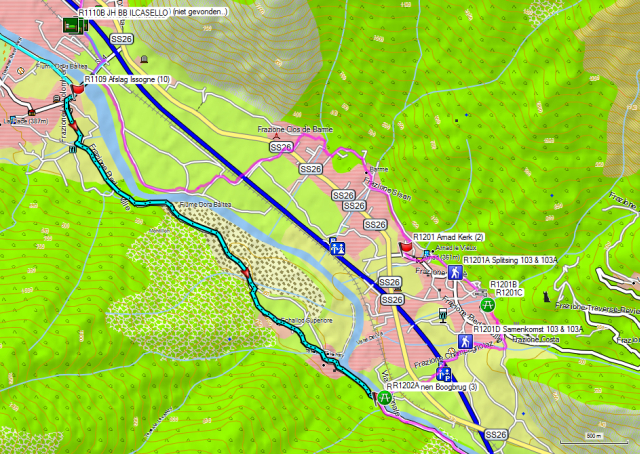 | R1401A Omweg via kerk, rechtdoor korter | N45 28 10.5 E7 57 20.2 | 243 m |