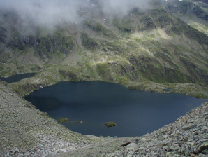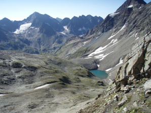 Je daalt nog verder af tot een hoogte van ca 2560m, alwaar je het pad komende van de Lienzer Hütte treft (AUTWH0313), om vervolgens de klim van bijna 800m naar de Niedere Gradenscharte (2796m) aan te vatten. Je klimt in een steenslaghelling afgezoomd door twee uitlopers van de hoofdgraad. Het pad is constant steil en klimt in kort zigzagbewegingen omhoog. Wanneer je bijna boven bent, zie je tegen de linker wand een staalkabel die je naar de top van de pas leidt. Eenmaal boven bevind je je in een bevreemdend landschap met een klein meertje en massa’s grote cairnes. Op het einde van het vlakke gedeelte vind je een wegwijzer bij GPS-punt AUTWH0315. Hier kan je nog naar de top van de Keeskopf (3081m) (AUTWH0317). Weet echter dat er niet echt sprake is van een pad, maar dat je je hier een weg moet banen tussen de rotsblokken, geleid door een aantal verfmarkeringen. (St & D: 285m, 1.45u).