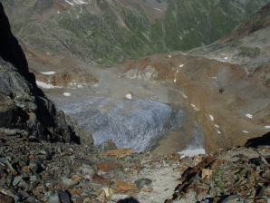 Het begint al met de waarschuwingen die er op de wegwijzer naar de Obere Gradenscharte (GPS Pad 29) staan, dat het pad enkel geschikt is voor mensen met hoogalpiene ervaring en dat het gebruik van stijgijzers wordt aangeraden. Gezien wij de tocht begin augustus ondernamen, waren die stijgijzers niet meer noodzakelijk. Het pad naar de pas is relatief eenvoudig, maar na de pas is er niets wat een pad genoemd kan worden. Het is een route, gevormd door een opeenvolging van verftekens door een puinhelling met stenen van middelgrote afmetingen. Vanaf de pas daal je hoofdzakelijk af langs de linker zijde van het puinveld, gezien vanaf de pas. In het bovenste deel moet je constant een plaats zoeken om je voeten te zetten en je evenwicht te behouden. Je bevindt je constant in zeer steil terrein. Lager vind je een touw van 115m dat er volgens de uitleg van de Hüttenwirt nog maar drie dagen eerder door hem was gelegd. Het touw leidt door een sleuf langs de linker zijde (van bovenaf gezien) van het puinveld, tot net boven het sneeuwveld. Net boven dit sneeuwveld is er een afsplitsing op het touw naar rechts en alzo word je langs een rotsblok geleid dat door de twee werd afgeklommen (hoogte ca 6m). De sneeuwhelling werd al skiënd op de schoenen afgedaald. Onder het sneeuwveld, wordt het terrein minder steil, maar je beweegt er nog steeds moeizaam tot je op een soort plateautje komt, waarna de hellingshoek verwaarloosbaar wordt. Het blijft echter ploeteren door het puinveld tot aan de hut. Vanaf dit plateautje waren de verftekens zichtbaar door de kijker. Wie zich na deze beschrijving nog geroepen voelt is of zeer ervaren of roekeloos.