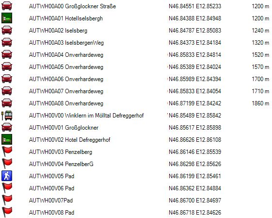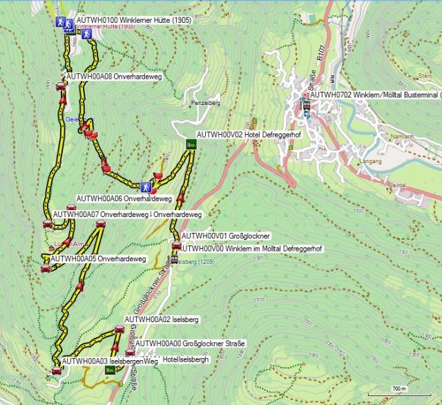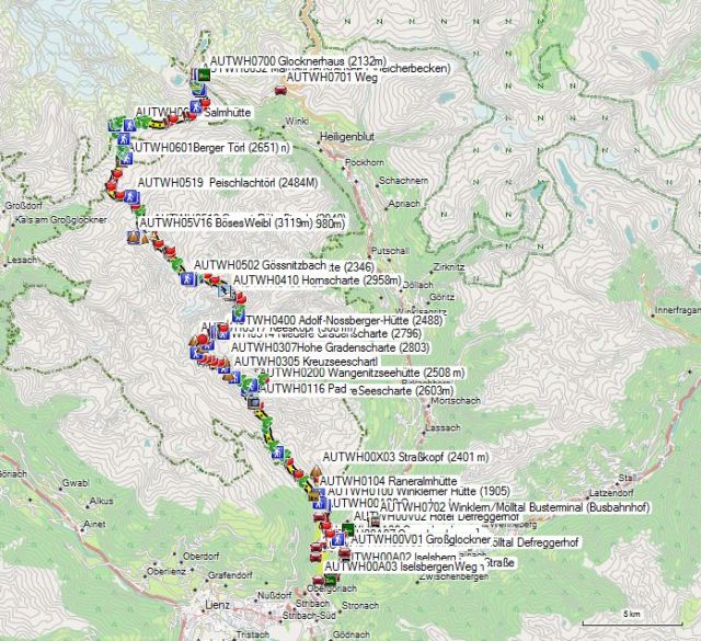 Wie in Winklern (950m) overnacht, moet 250 extra meters omhoog, eerst langs de weg en vervolgens via de rechtse variante omhoog naar de Winklerner Hütte (AUTWH0100). Maar je kan ook de bus nemen tot aan de Halte Defreggerhof (AUTWH00V00). Alles staat netjes aangeduid met een overvloed aan gele bordjes. De bordjes zijn tevens voorzien van een kleurcode die de moeilijkheid van het pad aangeeft. (blauw: gemakkelijk, rood: matig, zwart: moeilijk)
