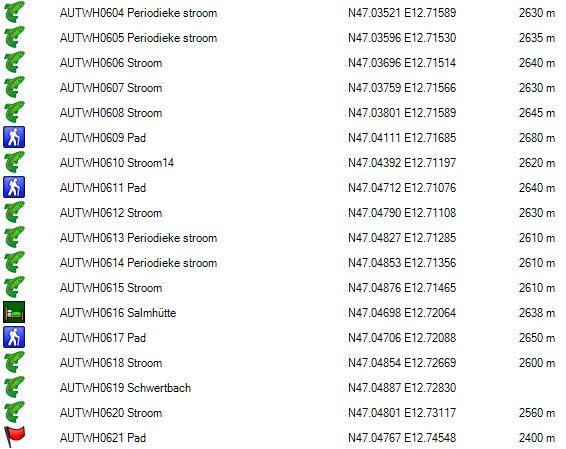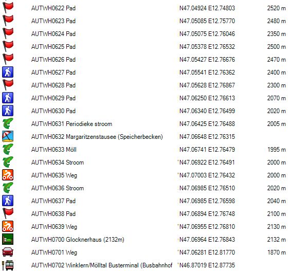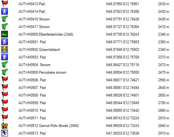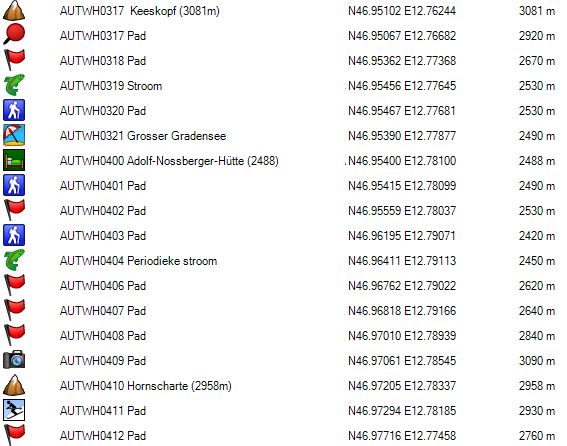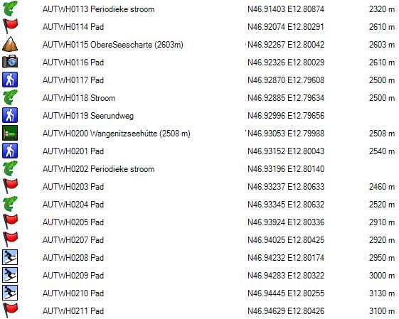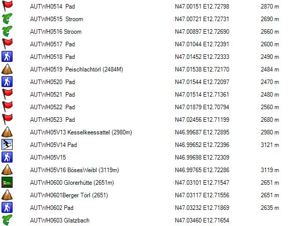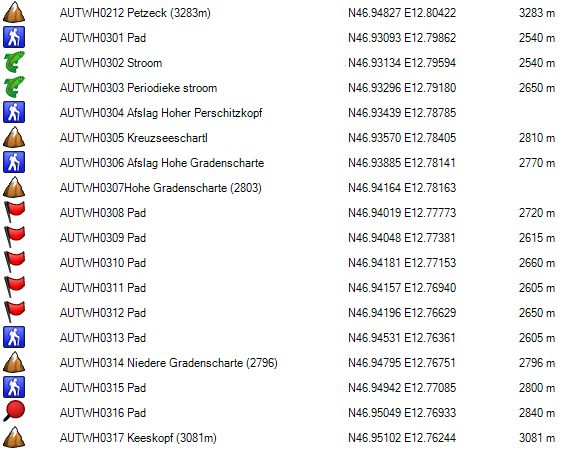 Opgelet: de tekening van de hoogtelijnen rond de top van Das Petzeck op de digitale kaarten stemt niet overeen met de werkelijkheid op het terrein. De oriëntatie van de GPS-tussenpunten is wel correct.
