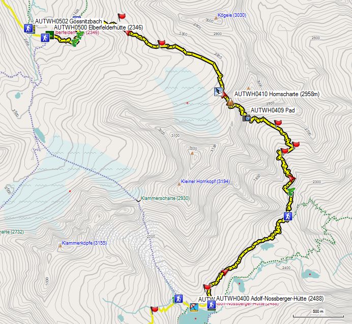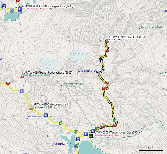 Ogenschijnlijk is de weg duidelijk korter en lijkt verleidelijk, maar je zal er in praktijk even lang over doen als via de Niedere Gradenscharte (AUTWH0314) en bovendien zal je terechtkomen in terrein waar enkel specialisten thuishoren. Aan de Adolf Nosseberger Hütte staat een krachtige kijker, waardoor ik het traject gedetailleerd heb kunnen bekijken. Bovendien heb ik er een Brit en een Duitser (woonachtig in Obersdorf tegen de grens met Oostenrijk) naar beneden zien komen en het is duidelijk een moeizame onderneming, die op elk ogenblik je alpiene beoordelingsvermogen en ervaring op de proef stelt. Ik persoonlijk kies er niet voor om extra risico te gaan zoeken.